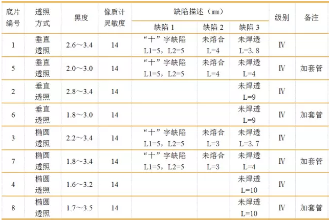 同時(shí),試驗(yàn)解決了因透照厚度差大,導(dǎo)致缺陷靈敏度無法滿足規(guī)范要求的問題,加套管缺陷基本能清晰顯示,但缺陷有略微放大現(xiàn)象,但不影響最終的檢測質(zhì)量評(píng)價(jià)。
