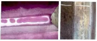 某體育場鋼結構支座出現熱裂紋,如圖5所示。因焊劑不合格,鋼結構制作焊接時出現大面積熱裂紋,如圖6所示。