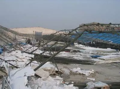 2010年12月15日凌晨1時30分左右,那達慕主會場即是伊金霍洛旗賽馬場,西側看臺鋼結構罩棚主結構發生 “坍塌”。2011年1月7日在現場看到,賽馬場西側看臺七八十米長的主體鋼結構罩棚塌落,看臺座椅被砸得七零八落(見圖1、圖2),無人員傷亡。